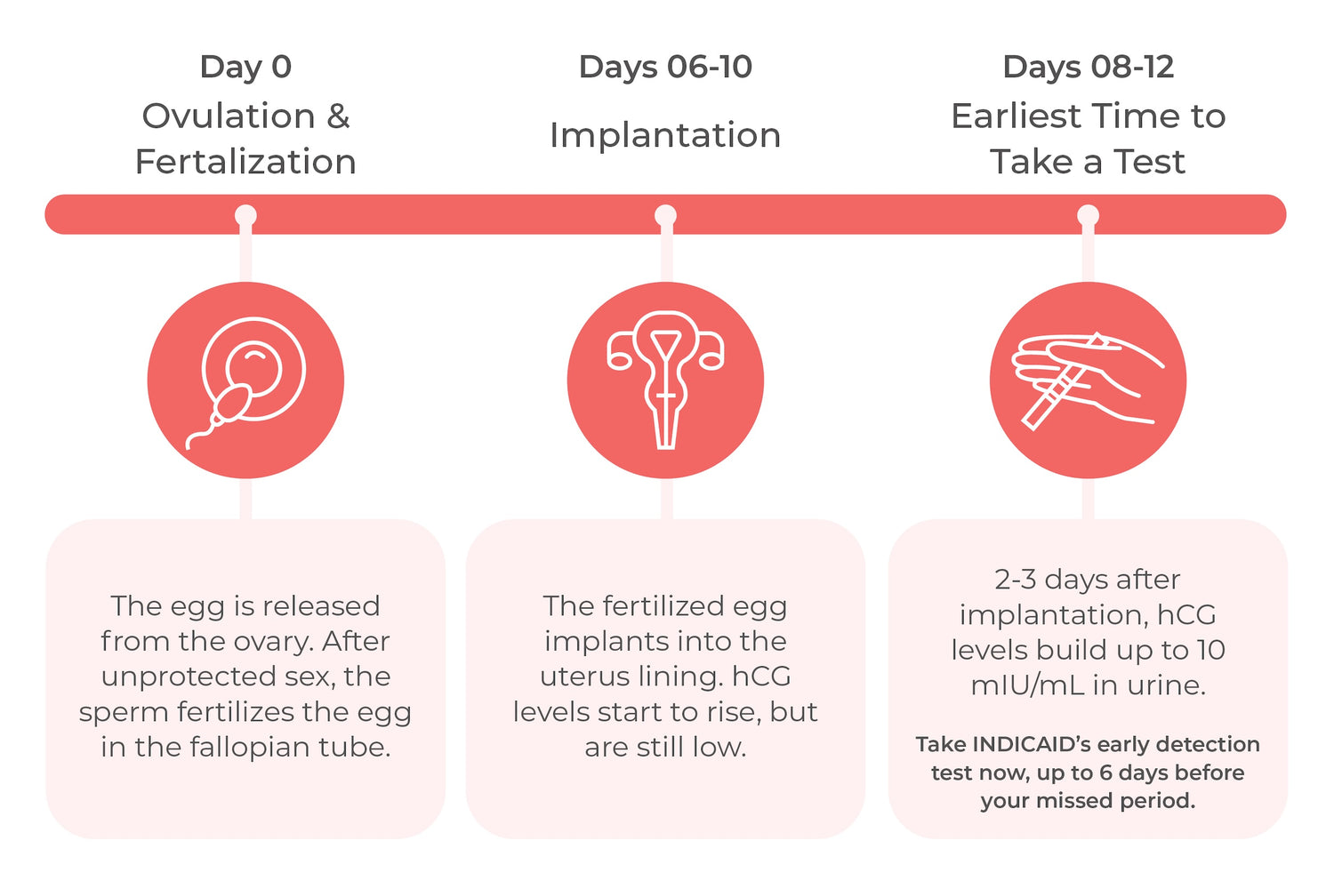 Detect Pregnancy up to 6 Days before Missed PeriodAt-home pregnancy tests are designed to detect human chorionic gonadotropin (hCG) in urine, the hormone your body produces in early pregnancy. After a fertilized egg implants in the uterus, hCG levels begin to rise quickly. Our ultra-sensitive test strips can detect even low levels of hCG — down to a 10 mIU/ml cut-off (compared to the typical 25 mIU/ml) — so you can know if you’re pregnant as early as 6 days before your missed period.