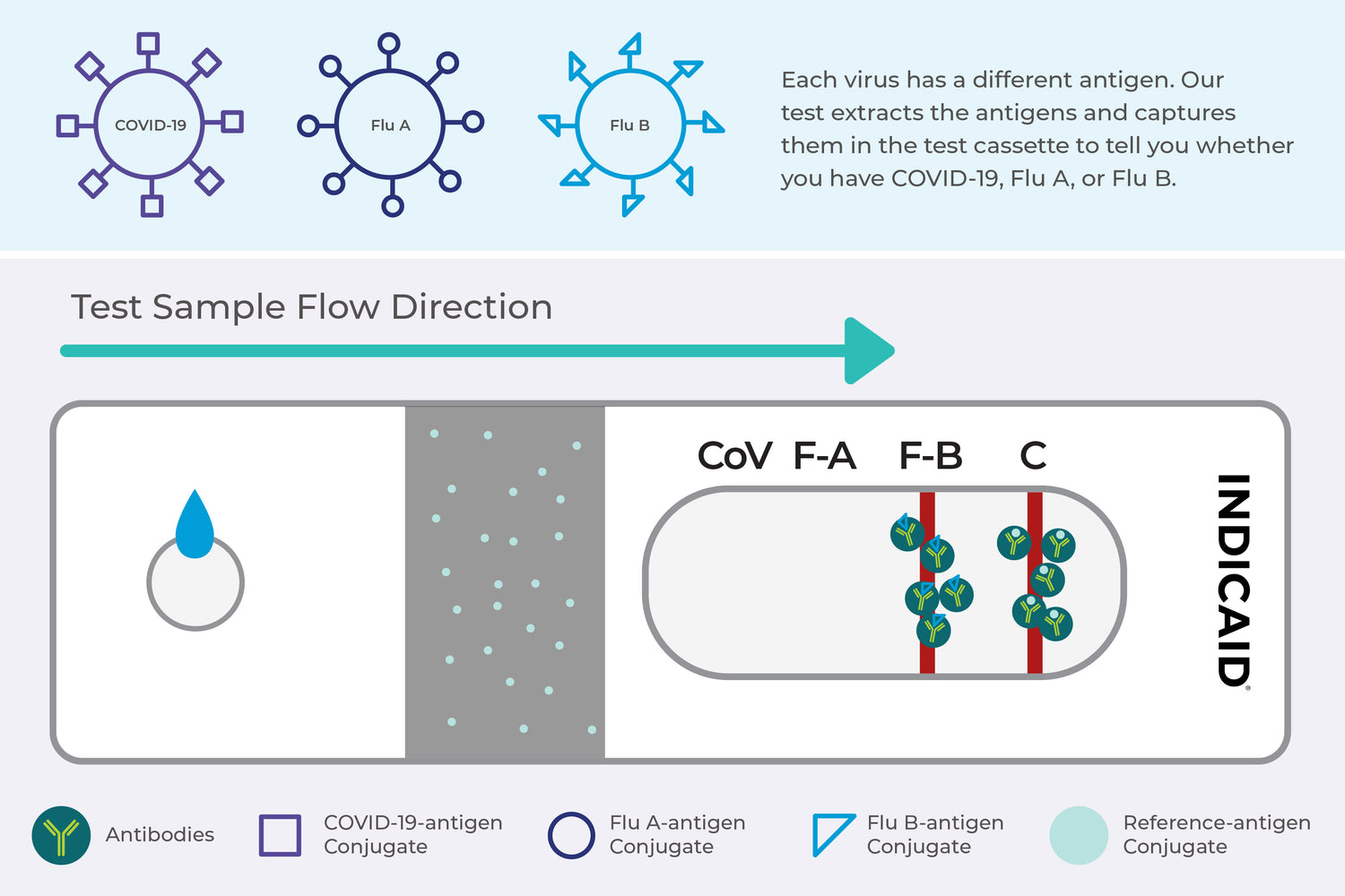 Detect COVID-19 & Flu A/BAt-home COVID-19 & Flu A/B antigen tests are designed to detect infections caused by SARS-CoV-2, Flu A and Flu B viruses. The science behind it: When these viruses enter your body, they each contain unique proteins called antigens that appear in your nose and throat. These antigens signal that your body is actively fighting SARS-CoV-2, Flu A and Flu B viruses. Our test is designed to detect different viral antigens for each virus. With a single test, you can identify whether your symptoms are due to COVID-19 or the flu. You can test at home and get clear results in just 10 minutes. Early detection helps you act quickly and protect those around you.